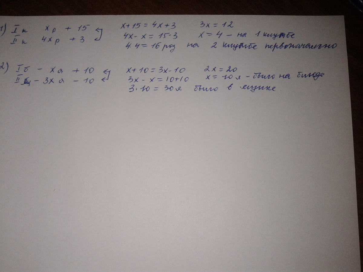 1) Пусть х кустов - на 1-ой клумбе, тогда 4х - на 2-ой. (х+15) кустов стало на 1-ой клумбе, а (4х+3) - стало на 2-ой. Зная, что кустов стало поровну, составим и решим уравнение: