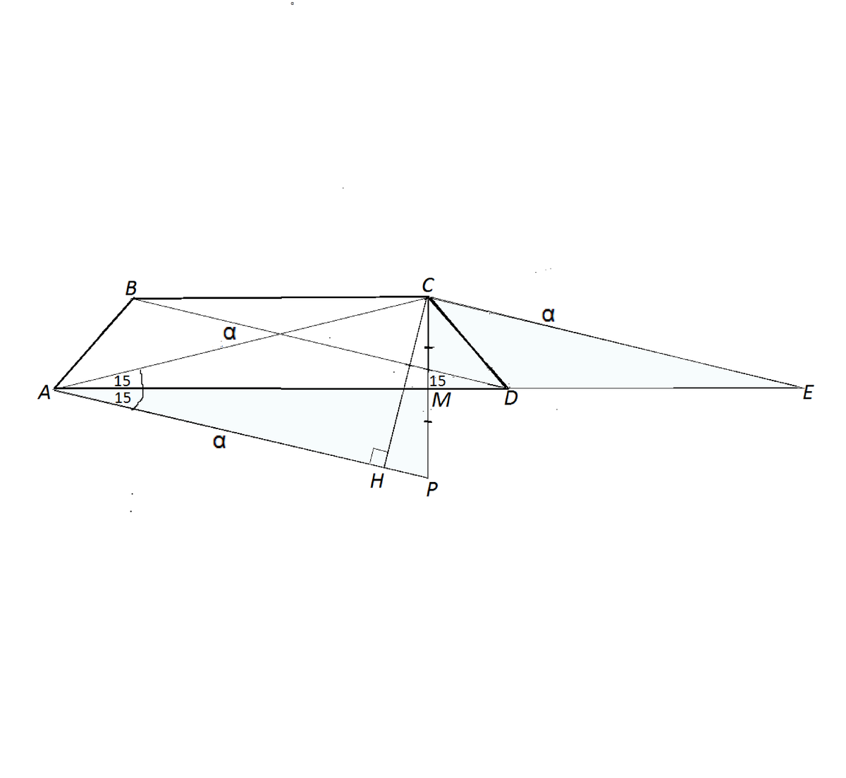 Диагональ равнобокой трапеции равна α (альфа) и составляет угол 15° с основанием. Найти площадь трапеции.