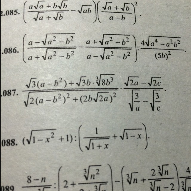 ( frac{a- sqrt{ a^{2}- { b^{2} }  } }{a+ sqrt{ a^{2} -b^{2}} } -  frac{a+ sqrt{ a^{2}- b^{2}  } }{a- sqrt{ a^{2}- b^{2}  } } ) :  frac{4 sqrt{ a^{4}- a^{2} b^{2}  } }{ (5b)^{2}} = frac{(a- sqrt{ a^{2}- b^{2} ) }^2- (a+ sqrt{a^2-b^2} )^2 }{a^2-a^2+b^2} ** frac{25b^2}{4 sqrt{a^2(a^2-b^2}) } = frac{(a- sqrt{a^2-b^2}-a- sqrt{a^2-b^2)}*(a- sqrt{a^2-b^2}+a+ sqrt{a^2-b^2})}{4asqrt{a^2-b^2}} = =- frac{4asqrt{a^2-b^2} }{4a sqrt{a^2-b^2} }=-1
