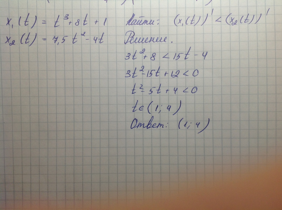 две точки движутся по оси ох по законам движения x1(t)=t^3+8t+1 и x2(t)=7,5t^2-4t (x-координата, t-время). Определите промежуток времени, в течение которого скорость первой точки меньше скорости второй.