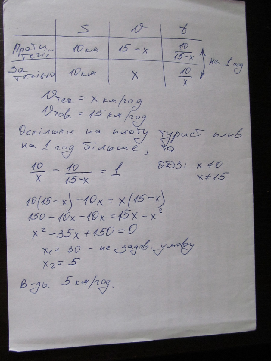 Поясніть як розв*язувати такі задачі. "Турист проплив на моторному човні 10 км проти течії річки і повернувся назад на плоту. Знайдіть швидкість течії річки, якщо на плоту турист плив на 1 год більше, ніж човном, а власна швидкість човна становить 15 км/год."