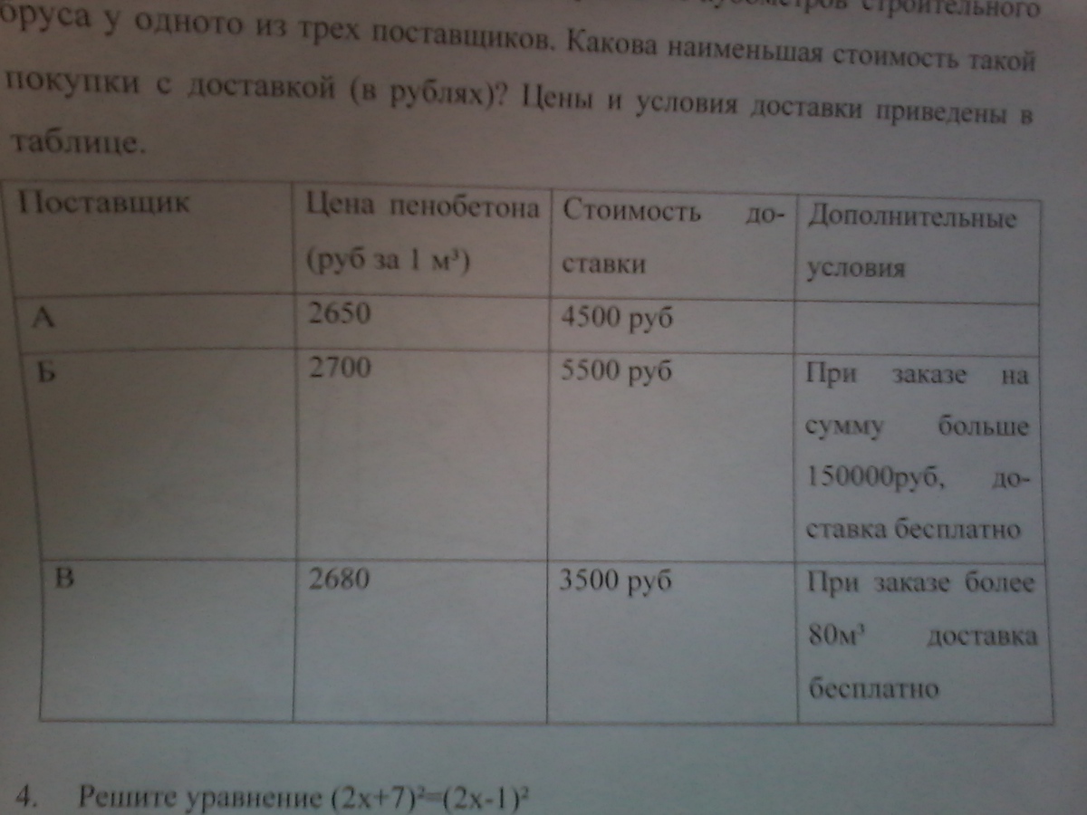 строительной фирме нужно приобрести 40 кубометров строительного бруса у одного из трех поставщиков. Какова наименьшая стоимость такой покупки с доставкой (в рублях)? Цены и условия доставки приведены в таблице