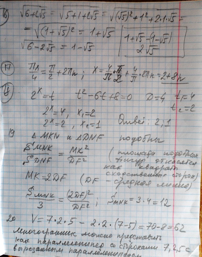 18)Пусть 2^x=a, тогда a²-6a+8=0, Д=6²-4*1*8=36-32=4, а1=6+√4/2=4, a2=6-√4/2=2,