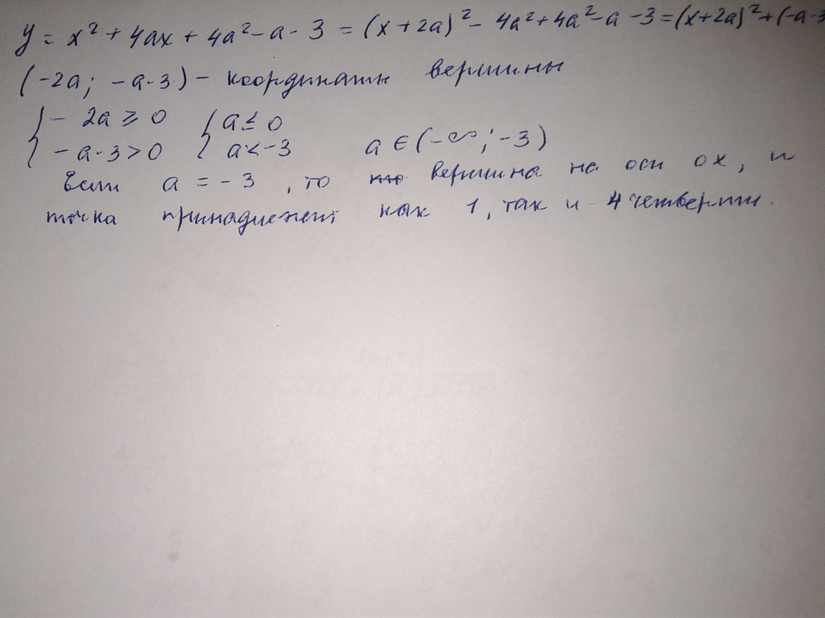Найти все значения параметра а, при которых вершина параболы y=x2+4ax+4а2-а-3 лежит в первой четверти (х>0,у>0).