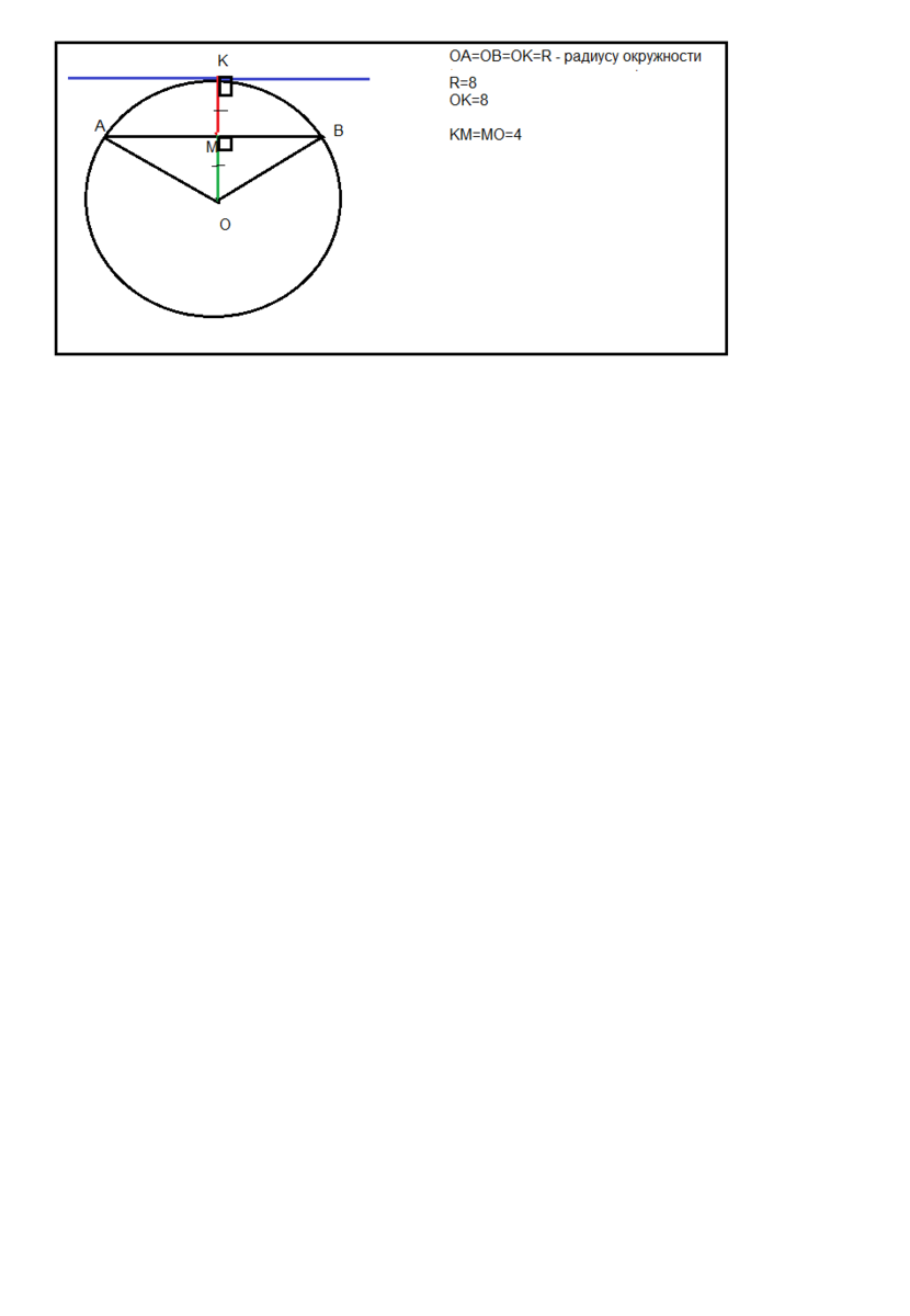 хорда ab равноудалена от центра окружности и от касательной, параллельной этой хорде. Радиус окружности равен 8. найдите длину хорды
