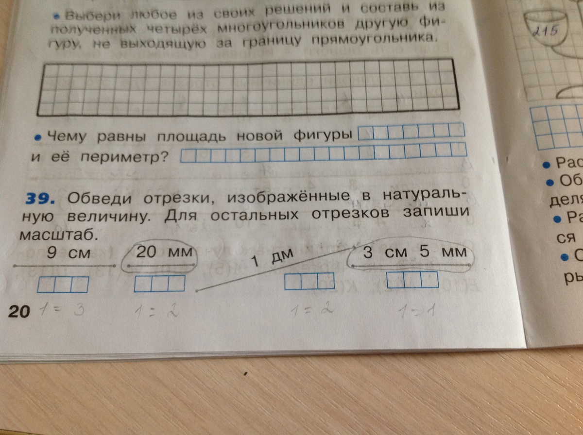 Все верно, обведено 20 мм=2см ( под отрезком 3 клеточки, они короче, а это 1.5 см) и 3 см 5 мм