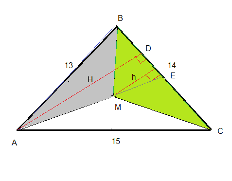 Треугольник ABC, стороны которого 13 см, 14 см и 15 см, разбит на три
