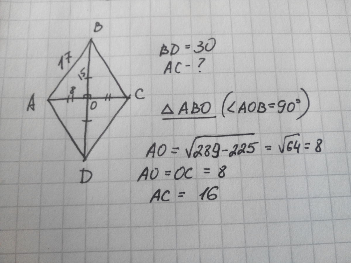 четырехугольник ABCD является ромбом у которого сторона AB равна 17 см,диагональ BD равна 30 см.найдите длину диагонали АС.