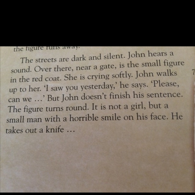 Джона сковал ужас. Он не просто напуган. Он на грани нервного срыва. Джон оглядывается. Улица пустынна. Кругом ни души. И тут он вспоминает, что в кармане его куртки лежит старый свисток. Свисток, который используют спортивные судьи. Джон хватает свисток и громко свистит. Мужчина в красном пальто цепенеет. Он явно не знает, что ему делать. Но свисток такой пронзительный что его слышат люди в соседнем доме. В одном из окон появляется свет. Джон, не переставая свистеть, идётк подъезду дома. Преступник не шевелится.