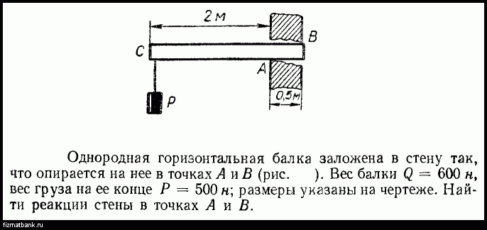 Однородная горизонтальная балка заложена в стену так, что опирается на нее в точках А и В. Вес балки 600Н, вес груза на ее конце 500Н, длина балки до стены 2м, толщина стены 0,5м. Найти реакции стены в точках А и В. Теперь с рисунком)