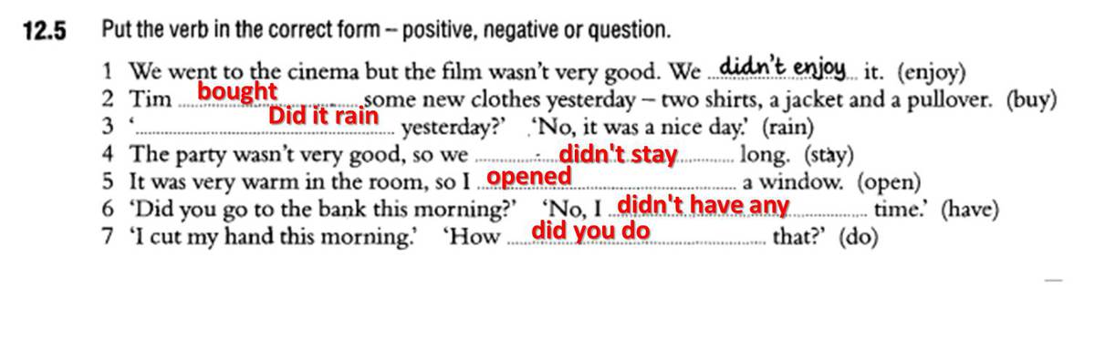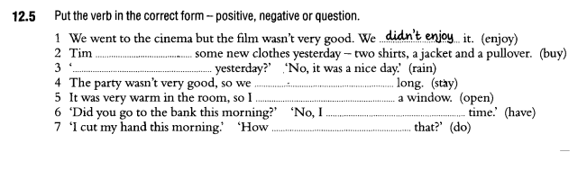 6 'Did you go to the bank this morning?' 'No, I had no time.' ИЛИ 'No, I didn't have any time'.