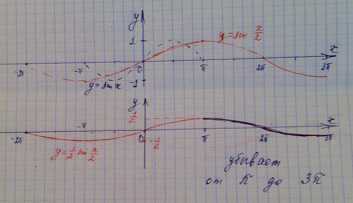 График функции у=1/2 sin x/2 получен из графика у= sin (x/2) сжатием вдоль оси ОУ в 2 раза.