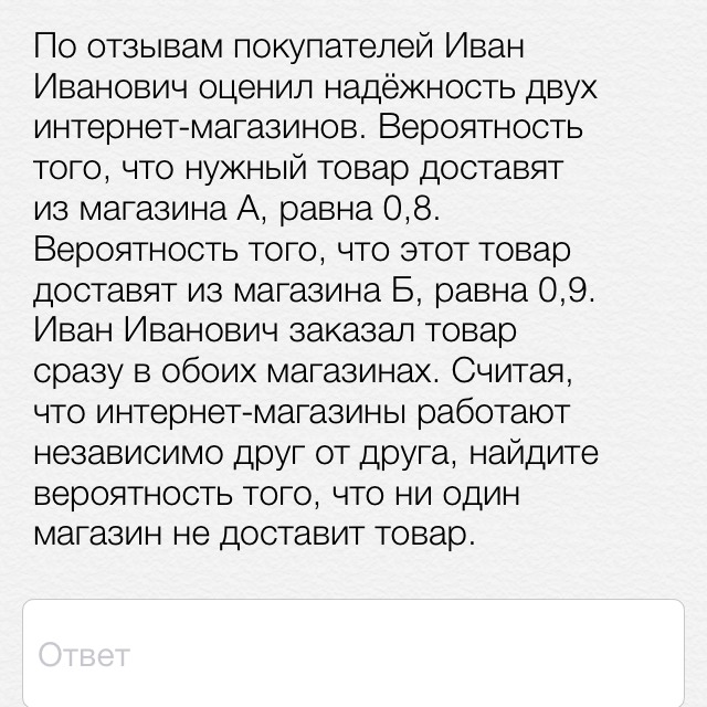 (1-0.8) = 0.2 - вероятность, что не доставит один, (1-0.9) = 0.1 - вероятность, что не доставит другой
