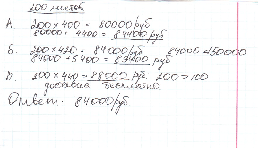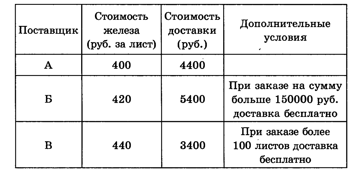 244) Строительной фирме нужно приобрести 200 листов кровельного железа у одного из трёх поставщиков. Цены и условия доставки приведены в таблице. Сколько рублей придётся заплатить за самую дешёвую покупку с доставкой.