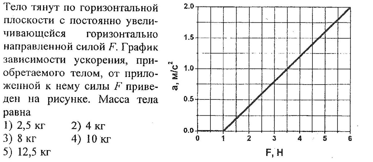 Тело тянут по горизонтальной поверхности с постоянно увеличивающейся горизонтально направленной силой F. График зависимости ускорения от силы приведен на рисунке. Чему равна масса тела?