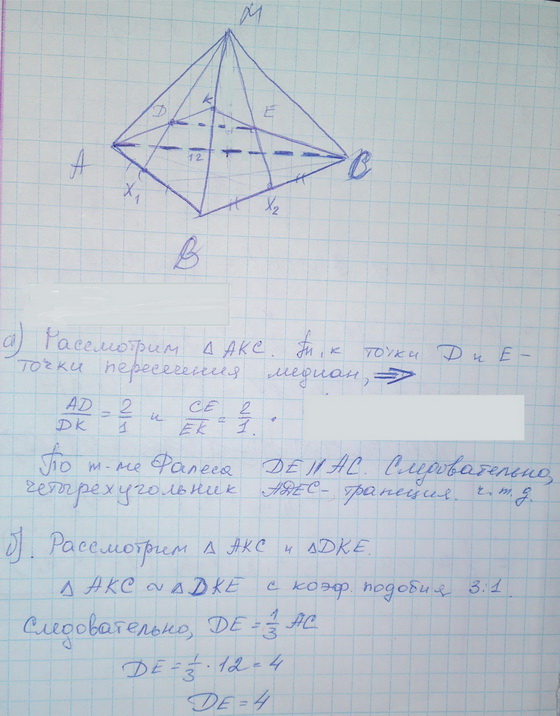 Точка М, лежащащая вне плоскости треугольника АВС, соединена с его вершинами. D и Е - точки пересечения медиан треугольников МАВ и МВС соответственно. а) Докажите, что АDЕС - трапеция. б) Найдите DE, если АС=12 см.