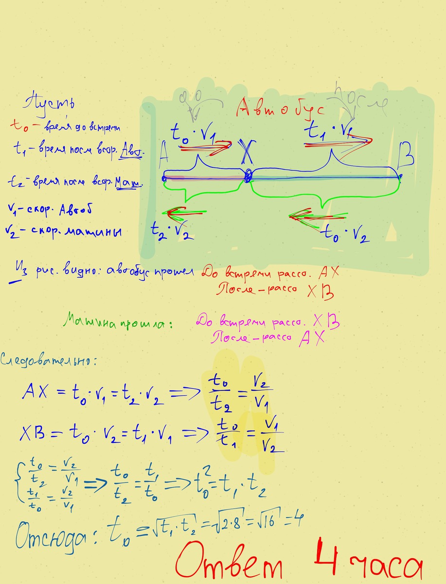 Известно время движения машины (t1) и автобуса(t2) после встречи: