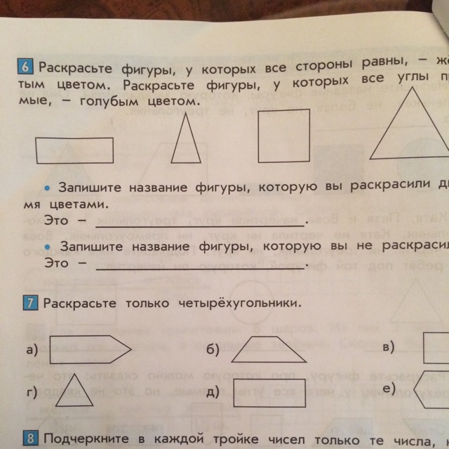 6) желтым - квадрат и второй треугольник, он называется равносторонний треугольник (это последние две фигуры)