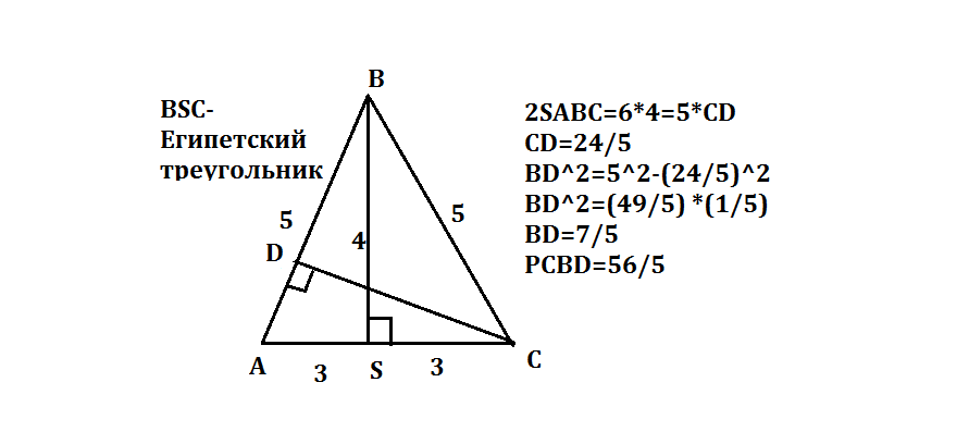 В равнобедренном треугольнике ABC основание AC=6 а высота опущенная на основание равна 4. Найти периметр треугольника CBD, где CD-высота, опущенная на боковую сторону.