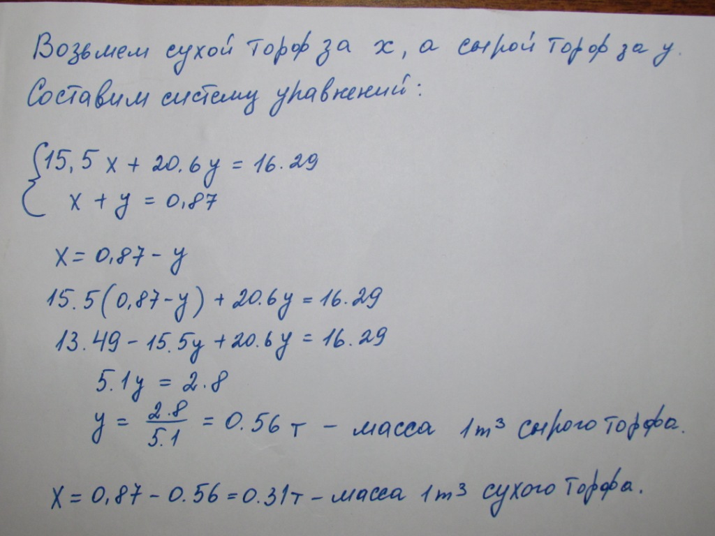 15,5 куб. м. сухого и 20,6 куб. м. сырого торфа имеют массу 16,29 т. Определите отдельную массу 1 куб. м. сухого и 1 куб. м. сырого торфа, если их общая масса 0,87 т?