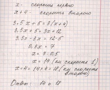скорость одного велосипедиста на 4 км/ч больше скорости другого,поэтому он за 3 ч проезжает на 5 км >,чем другой велосипедист за 3,5 ч . с какой скоростью двигается каждый велосипедист ?