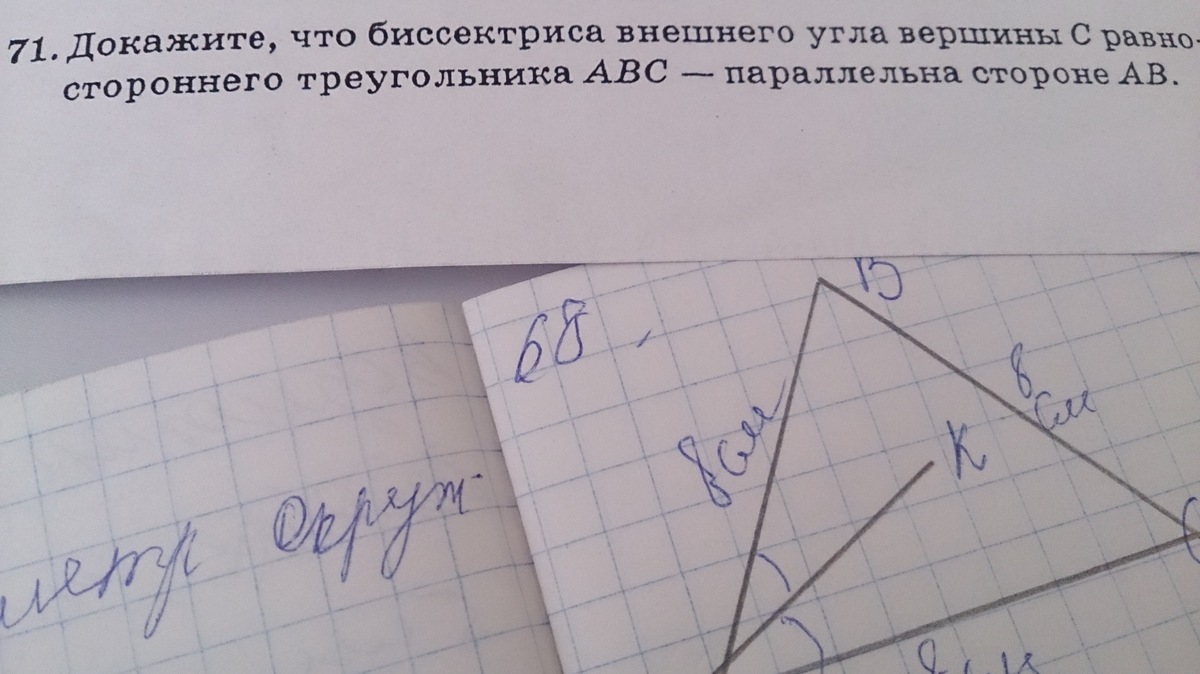 То есть и биссектриса внутреннего угла, и противоположная сторона перпендикулярны биссектрисе внутреннего угла. Значит, они параллельны.