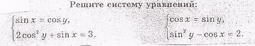 выражаешь sinx. т.е., первая строчка остается без изменений в системе а вторая: sinx = 3- 2cos^2y.