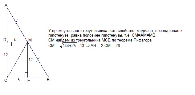 Знайдіть гіпотенузу прямокутного трикутника, якщо відстані від її середини до катетів дорівнюють 5 см і 12 см. Якщо не складно,було б добре прикріпити малюнок як ця побудова виглядає.Дякую.