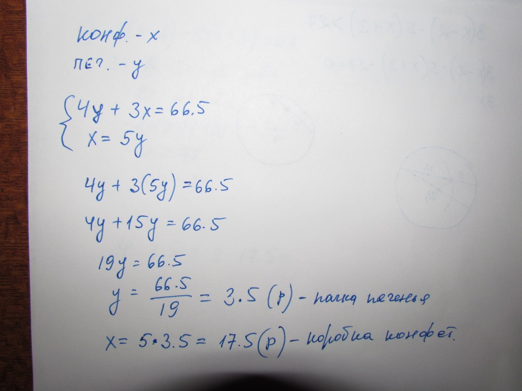 На 66,5 руб. купили 4 пачки печенья и 3 коробки конфет. Каждая коробка конфет стоила в 5 раз дороже пачки печенья. Сколько стоила коробка конфет