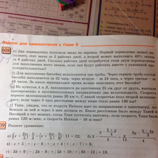 в) 20 км/ч - скорость первого велосипедиста; х км/ч - скорость второго велосипедиста; (20 + х) - скорость удаления при движении в противоположных направлениях; S = 130 - 25 = 105 км; t = 3 ч; S = v * t
