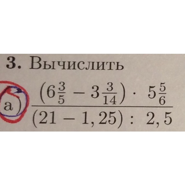 ((6 3/5 - 3 3/14) * 5 5/6) : ((21 - 1,25) : 2,5) = 2,5