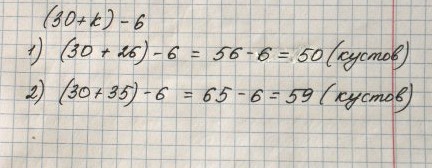 На одной грядке посадили 30 кустов клубники а на другой к кустов.Погибло 6 кустов.Сколько кустов клубники осталось на грядках?Составьте выражение для решения этой задачи.При к=26,35