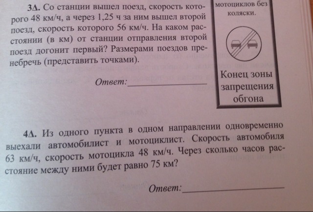 1) 63 - 48 = 15 (км/ч) - скорость отставания мотоциклиста;