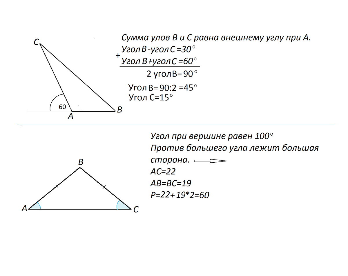 1)Внешний угол треугольника авс равен 60 градуса а разность внутренних углов не смежных с ним равен 30 градуса Найти все углы треугольника
