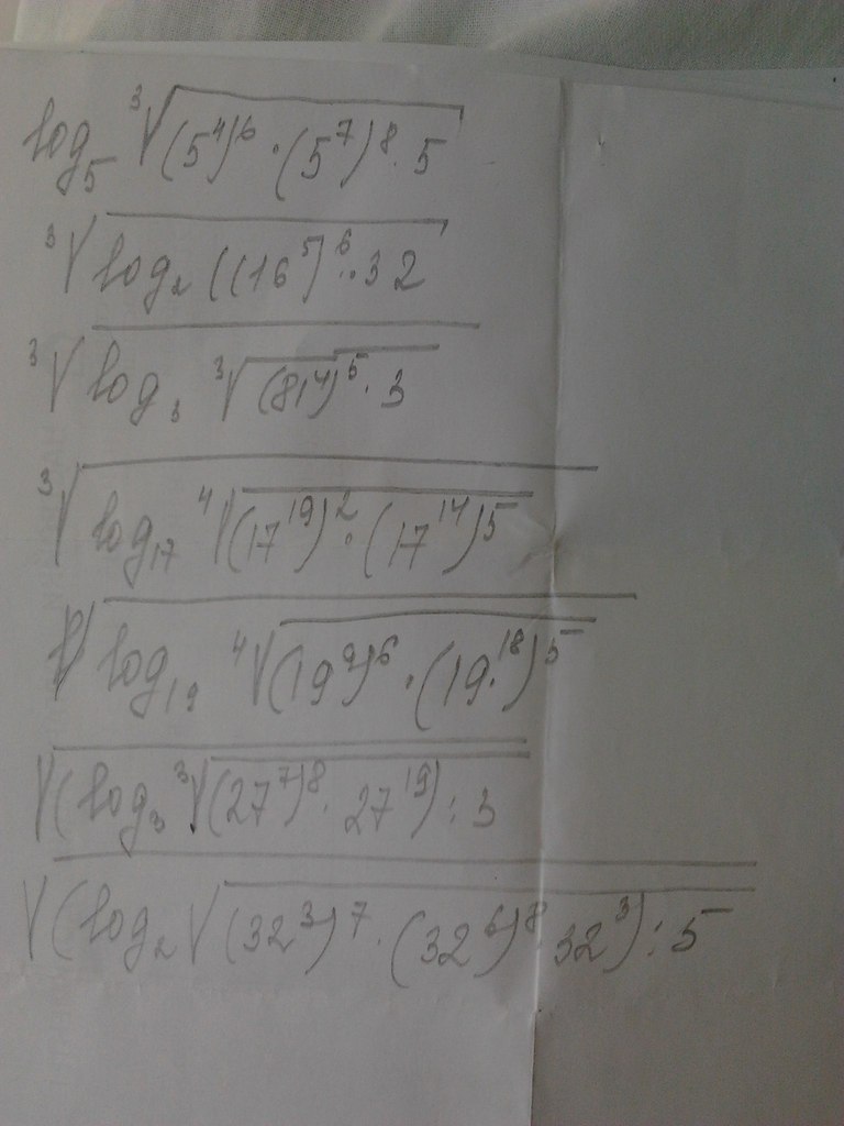 1) Log(5) (3)V(5^24 * 5^56 * 5) = Log(5) (3)V(5^(24 + 56 + 1) = Log(5) (3)V(5^81) = Log(5) 5^(81/3) = Log(5) 5^27 = 27