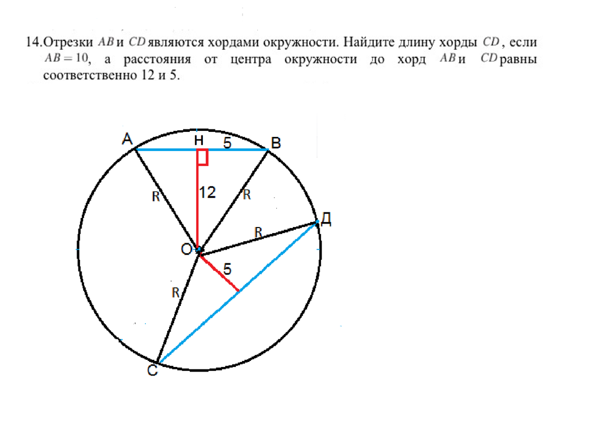 Отрезки АВ и СD являются хордами окружности. Найдите длину хорды СD, если АВ=10, а расстояние от центра окружности до хорд АВ и CD равно соответственно 12 и 5.