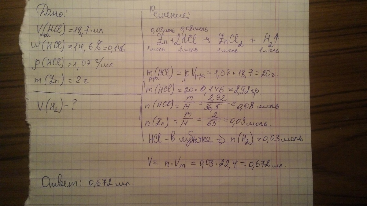 хлоридной кислоты объемом 18,7мл с массовой долей 14,6% (плотность