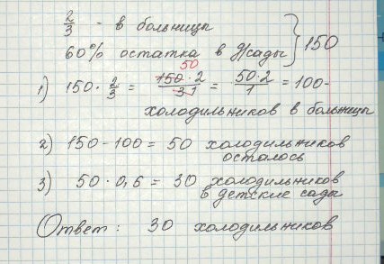 Во время субботника заводом было выпущено 150 холодильников.2/3 этих холодильников было отправлено в больницы,А 60% оставшихся-в детские сады,сколько холодильников было отправлено в детские сады?