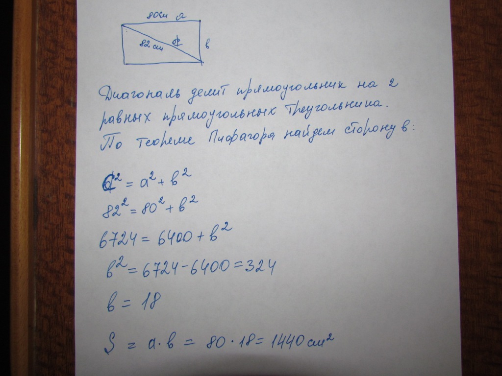 Нужно найти площадь прямоугольника, зная, что диагональ - 82 см, а сторона "а" - 80 см.