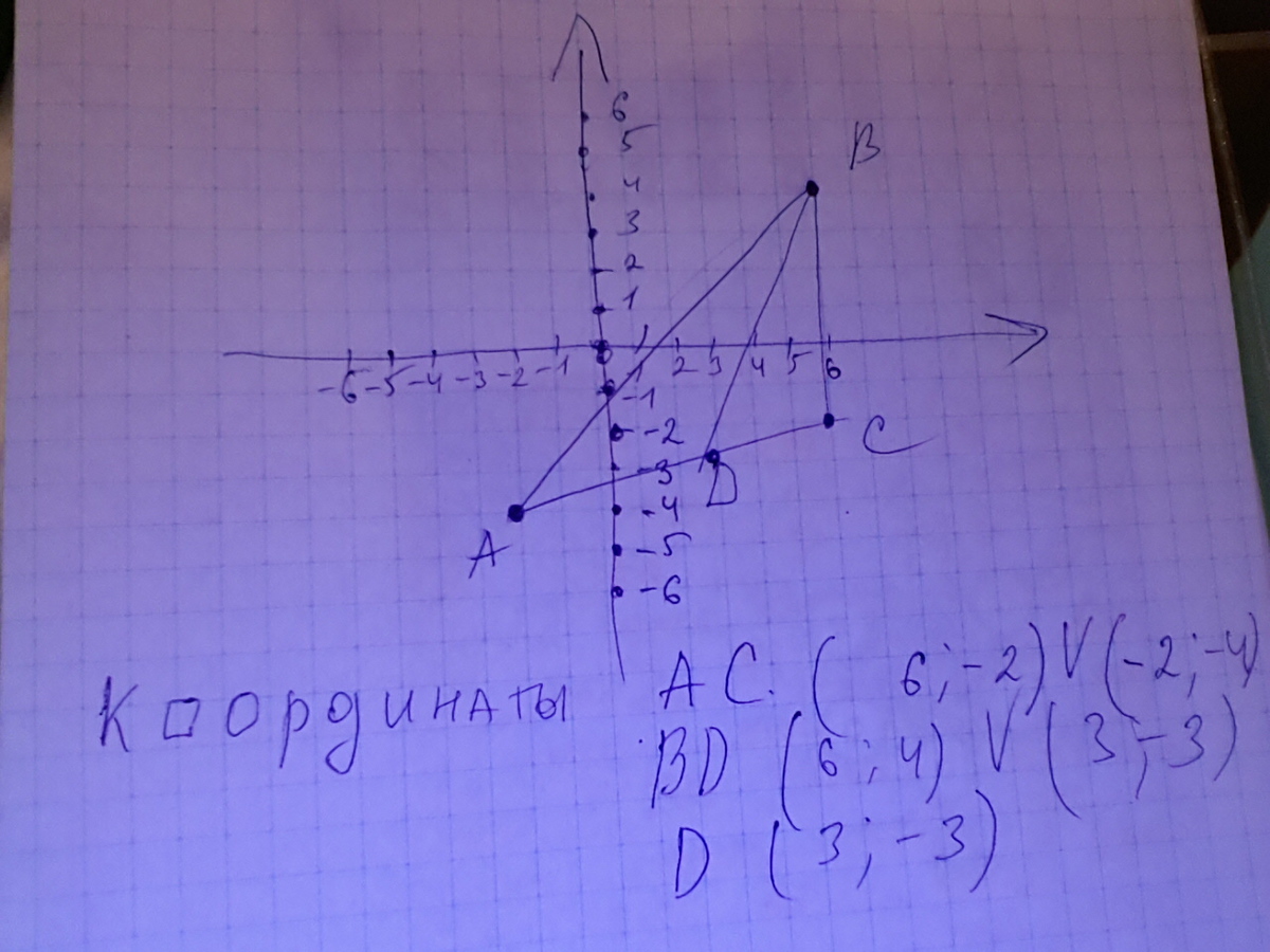 1) Постройте в координатной плоскости прямоугольник ABCD, если A(-2;4), B(6;4), C(6;-2). Укажите координаты точки D.