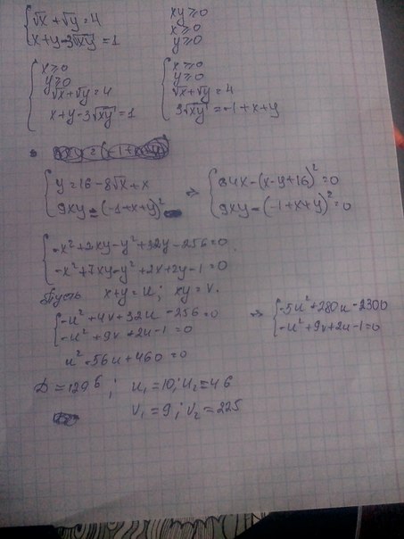 система уравнений: корень из X +корень из Y=4, X + Y - 3 * корень из XY=1.