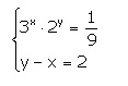 б){3^(x)*2^(y)=1/9 {y-x=2