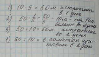 Помогите решить задачу: в мастерской в 1 день изготовили 5 палаток, истратили по 10 метров ткани на каждую. Во 2 день на такие палатки истратили на 1/5 больше. Сколько таких палаток изготовили во второй день?