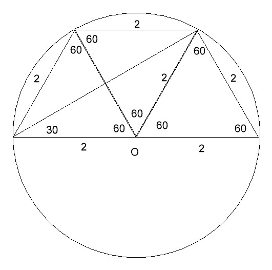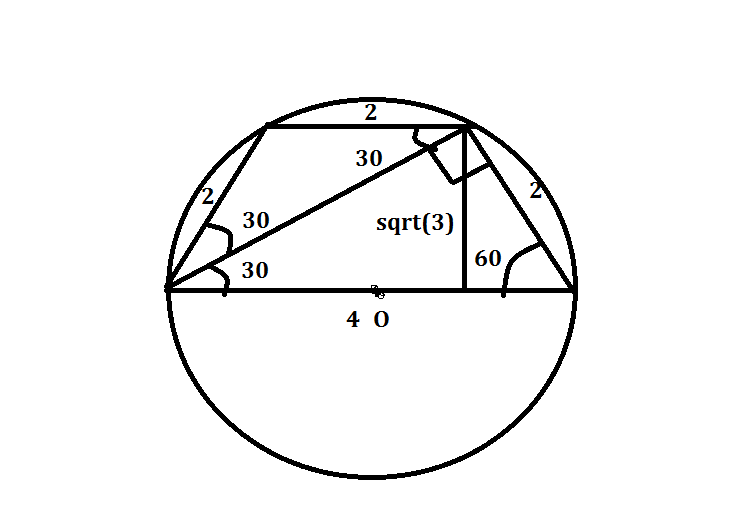 Диагональ трапеции составляет с большим основанием угол в 30градусов, а центр окружности, описанной около трапеции, принадлежит этому основанию. Найдите площадь трапеции, если её боковая сторона равна 2см.(ПОЖАЛУЙСТА РЕШИТЕ С РИСУНКОМ, УМОЛЯЮ)