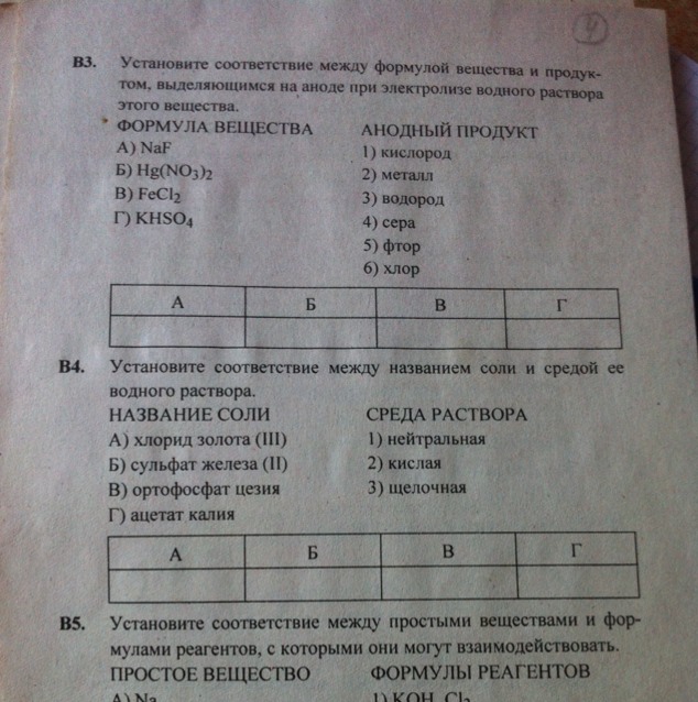 B3. При электролизе водного раствора на аноде окисляется кислотный остаток. Если он содержит кислород, то на аноде выделяется O₂, иначе - само вещество (Cl₂, S и т.д.). Исключение фторид-ион, он не окисляется и поэтому на аноде выделяется кислород.