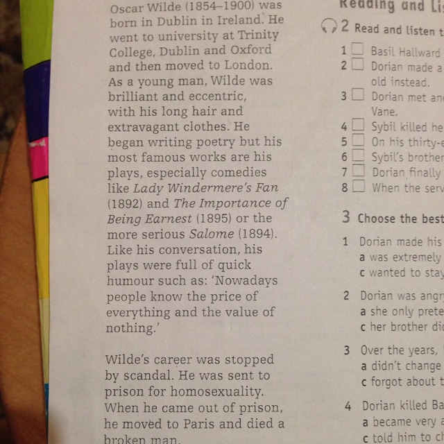 As a young man, Wilde was brilliant and eccentric, (Past Simple Active) with his long hair and extravagant clothes. He began (Past Simple Active) writing poetry but most famous works are his plays, (Present Simple Active) especially comedies like Lady Windermere's Fan (1892) and The Importance of Being Earnest (1895) or the more serious Salome (1894).
