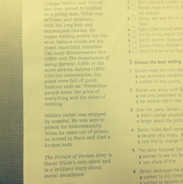 The Picture of Dorian Gray is Oscar Wilde's only novel (Present Simple Active) and is a brilliant story (Present Simple Active) about moral decadence.