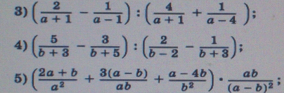 1) (2/(a + 1) - 1/(a - 1)) : (4/(a + 1) + 1/(a -4)) = (2(a - 1) - (a + 1))/(a - 1)(a + 1) : (4(a - 4) + (a + 1))/(a + 1)(a - 4) = (2a - 2 - a - 1)/(a + 1)(a - 1) : (4a - 16 + a + 1)/(a + 1)(a - 4) = (a - 3)/(a + 1)(a - 1) * (a + 1)(a - 4)/(5a - 15) = (a - 3)/(a - 1) * (a - 4)/5(a - 3) = (a - 4)/5(a - 1)