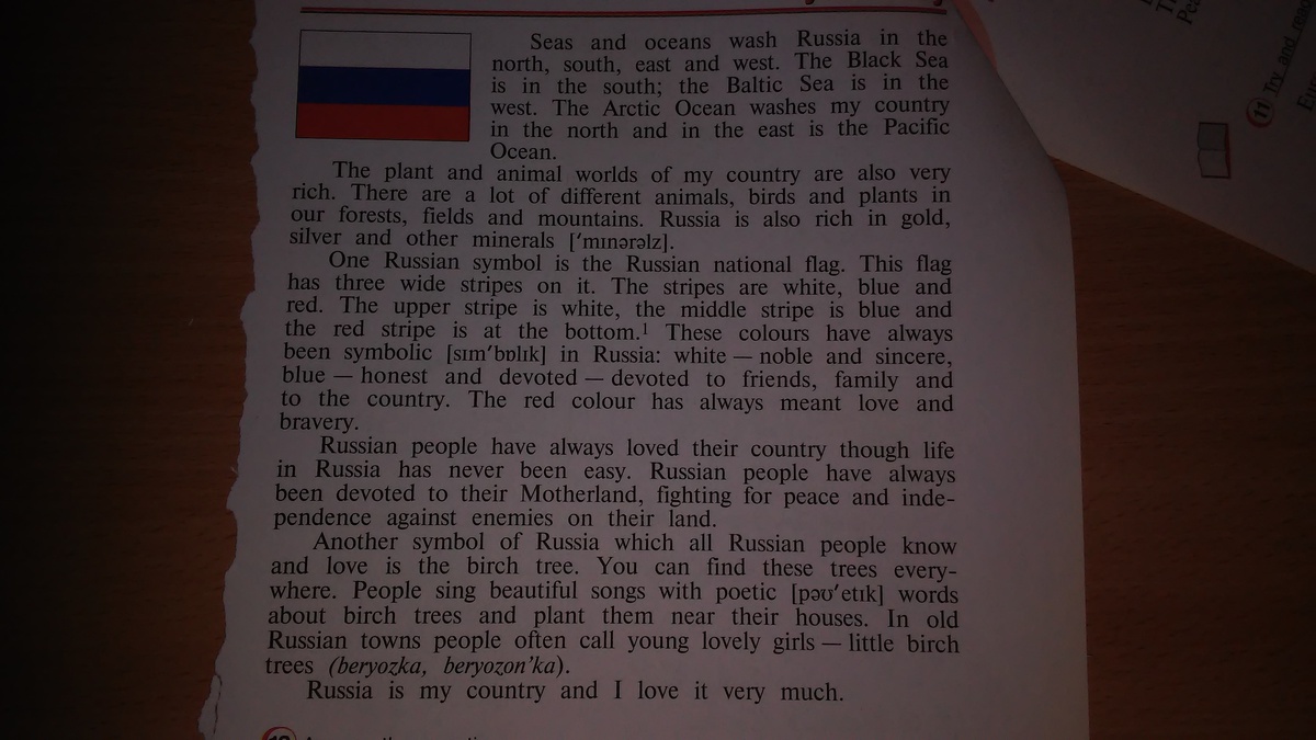 Растительный и животный мир моей страны также очень богат. В наших лесах, полях и горах живут много различных животных, птиц и растений. Россия также богата золотом, серебром и другими минералами.