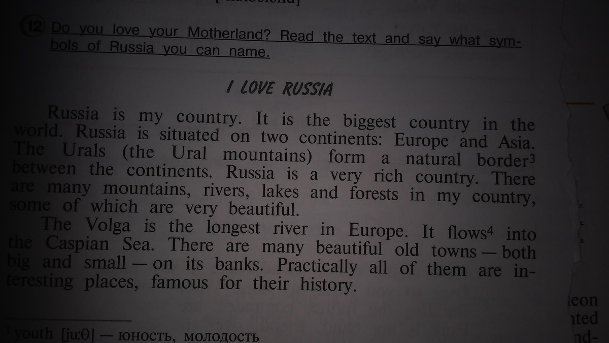 Урал (Уральские горы) образуют естественную границу между континентами. Россия очень богатая страна. В моей стране много гор, рек, озер и лесов, некоторые из которых очень красивые. Волга - самая длинная река в Европе. Она впадает в Каспийское море. На ее берегах расположено много красивых старых городов - больших и малых. Практически все они интересные места, известные своей историей.